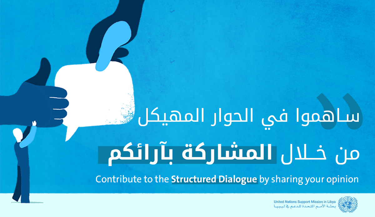 تسعى البعثة إلى جمع آراء ومساهمات الليبيين. ولإطلاق هذه المبادرة، دعت البعثة الليبيين يوم 27 أكتوبر إلى المشاركة في جلسة حوار مباشر عبر الإنترنت مع نائبة الممثلة الخاصة للأمين العام، السيدة ستيفاني خوري. ولتوسيع دائرة المشاركة خصوصاً لأولئك الذين لم يتمكنوا من حضور الجلسة المباشرة، تُجري البعثة الآن استطلاعاً إلكترونياً تتناول ذات الأسئلة. سيتم جمع وتحليل الآراء الواردة من النموذج المباشر وهذا الاستطلاع وتضمينها في تقرير يوضع على طاولة الحوار المهيكل بهدف اثراء برنامج العمل.