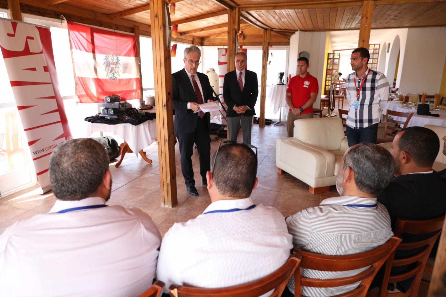 وفي إحتفال اليوم في مقر الأمم المتحدة في طرابلس بليبيا تم تسليم معدات التخلص من الذخائر المتفجرة إلى 16 ليبياً من العاملين المدربين على التخلص من الذخائر المتفجرة - أربعة منهم من المهندسين العسكريين الليبيين و12 من هيئة السلامة الوطنية - كانوا قد تلقوا تدريباً على التخلص من الذخائر المتفجرة بتمويل من المملكة المتحدة في تشرين الثاني/ نوفمبر 2017.