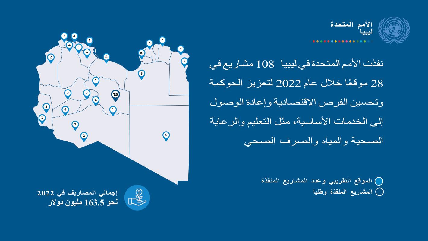 طرابلس – في عام 2022، عملت الأمم المتحدة في ليبيا على تعزيز السلام والتنمية المستدامين لفائدة جميع الناس في كافة أنحاء ليبيا من خلال دعم الحوكمة الرشيدة وإعادة توفير الخدمات الاجتماعية الأساسية وتحسين الفرص الاقتصادية.