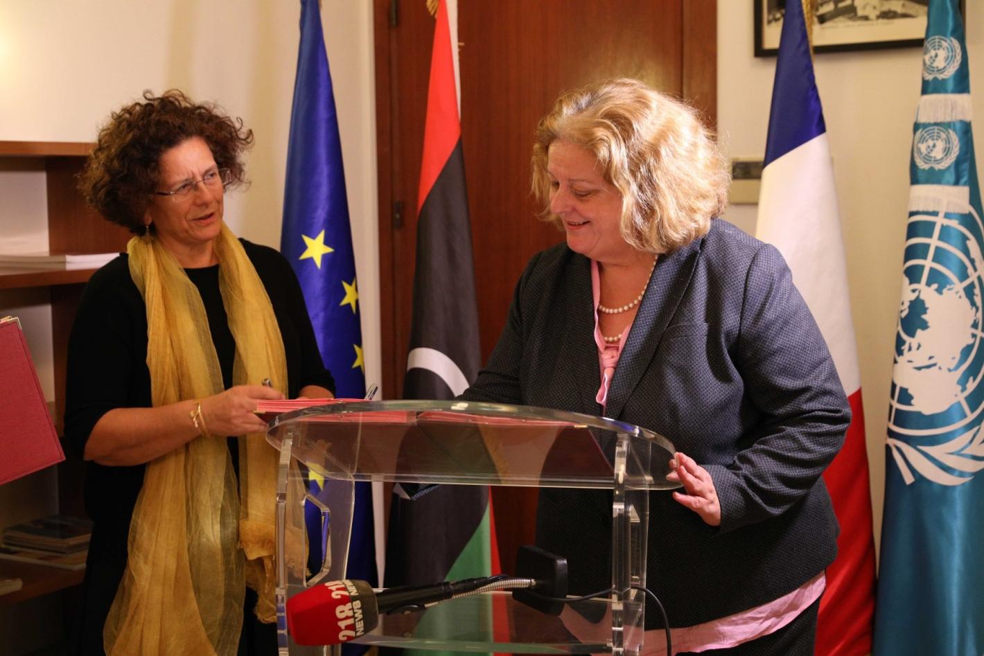 تونس، 4 ديسمبر 2017 – وقّعت سعادة سفيرة فرنسا لدى ليبيا، السيدة بريجيت كورمي، ونائبة الممثل الخاص للأمين العام للأمم المتحدة والممثلة المقيمة لبرنامج الأمم المتحدة الإنمائي في ليبيا، السيدة ماريا فال ريبيرو، اليوم بمقر سفارة فرنسا بليبيا الموجود حاليا بتونس العاصمة اتفاق مساهمة فرنسا في مشروع الأمم المتحدة الانتخابي في ليبيا الذي يحمل عنوان "تعزيز الانتخابات من أجل الشعب الليبي". وتعد مساهمة فرنسا في هذا البرنامج والبالغ قيمتها 200 ألف يورو الثانية من نوعها بعد الإتفاق الذي وقّع مؤخرا مع هولندا.