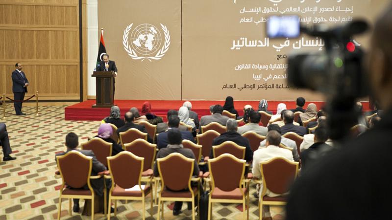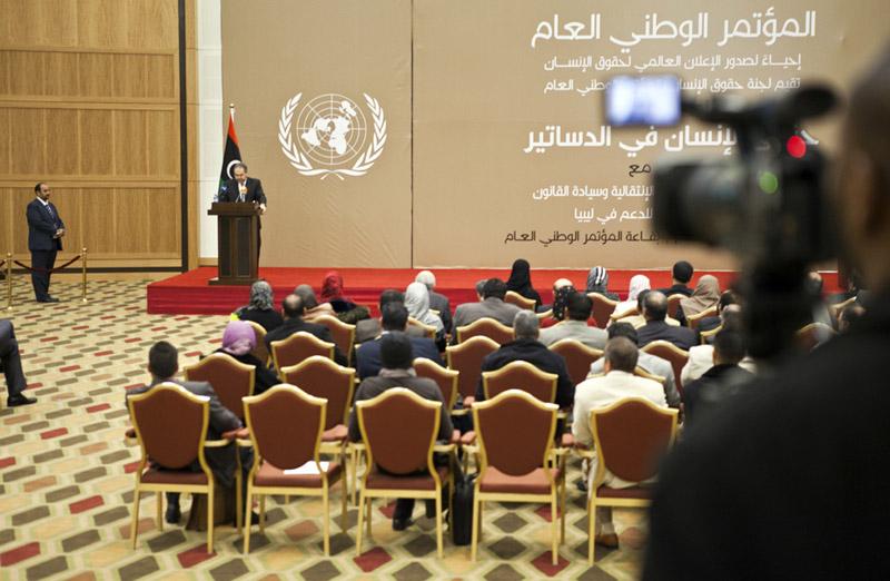 يطيب لي ان اشارك اليوم الاحتفال باليوم العالمي لحقوق الانسان والذي تنظمه لجنة حقوق الانسان بالمؤتمر الوطني العام بالتعاون مع قسم حقوق الانسان والعدالة الانتقالية وسيادة القانون ببعثة الامم المتحدة للدعم في ليبيا بعنوان "حقوق الانسان في الدساتير". فكما تعلمون اعتمد في هذا اليوم من العام 1948 الاعلان العالمي لحقوق الانسان. وهو ما يدعونا كل عام للعودة اليه، لا لمجرد التعريف به نصاً مرجعياً فحسب، بل لانه بات بنظر الكثيرين حمالاً لقيم انسانية مشتركة ولمعايير في الحكم على افكار وممارسات تتعلق بحرية الانسان وكرامة الشعوب. كما يصادف اليوم الذكرى العشرين لاعلان فيينا الصادر عن المؤتمر الدولي لحقوق الانسان في العام 1993 وهو علامة بارزة في مسار متواصل وطويل.