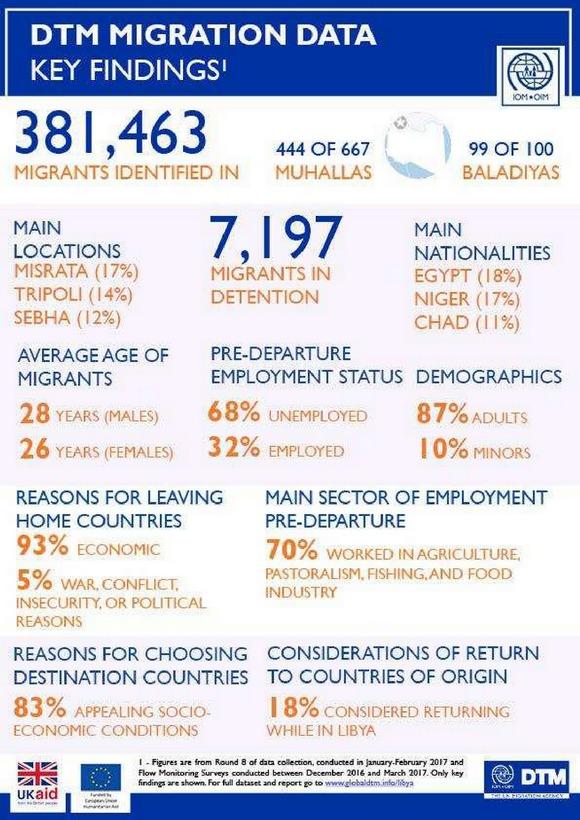 وتندرج هذه البيانات في إطار مجموعة معلومات الهجرة للجولة الـ8 والخاصة بمصفوفة تتبع النزوح وهي تمدّنا بيانات مجمّعة بين ديسمبر 2016 ومارس 2017 وتبرز تواجد 381.463 مهاجرا بليبيا خلال تلك الفترة.