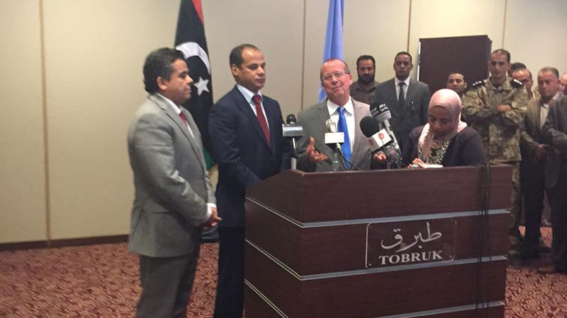 معالي الوزير، السيد النائب الثاني لرئيس مجلس النواب، الزملاء الأعزاء الإعلاميين، أعضاء مجلس النواب، أشكركم على استقبالي هنا بهذا الترحاب. يسعدني كثيراً أن أكون بينكم اليوم لأن لدينا مشكلات علينا حلها. إنه الأسبوع الأول الذي أعمل فيه على هذا الملف وقررت في أول زيارة أن اتي مباشرة إلى ليبيا وإلى طبرق.