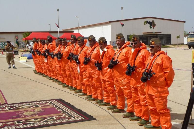 مرتدين ملابسهم الواقية ذات اللون البرتقالي المتوهج والأقنعة السوداء الواقية من الغاز، انهمك 19 من أفراد الدفاع الجوي الليبي بمباشرة مهمتهم وعرض مهاراتهم المكتسبة حديثا حول كيفية التعامل مع الأزمة الناجمة عن تسرب وقود الصواريخ…