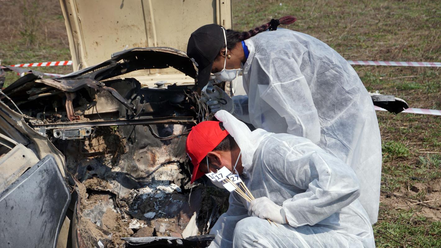 During the intensive three-week course, facilitated by UKROBORONSERVICE, the officers increased their knowledge about the theory and principles of explosive weapons and threats, as well as the specific skills needed to perform DSIM. The course, that was completed on 26 April, covered subjects such as forensic scene management, forensic evidence preservation, and the collection of evidence. During the final week of training, the participants conducted practical field exercises which involved the use of live explosives. The participants also had the opportunity to benefit from Ukrainian forensic experience during visits to the Interior Ministry’s Forensic Science Laboratory and National Forensic Investigation Department.