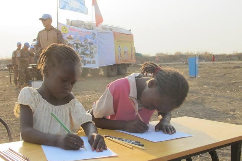 Displaced children drawing pictures of their future dreams at "fun" day of activities and treats organized by Mongolian battalion at protection areas of UNMISS base in Bentiu, Unity State. Photo: UNMISS/Anna Adhikari