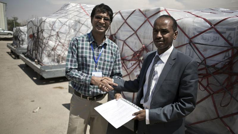 The UN Development Programme (UNDP) Country Director for Libya, Selva Ramachandran, and Abubaker Mohammed Marda, member of Libya's High National Elections Commission (HNEC), were on hand at the airport to receive the shipment.