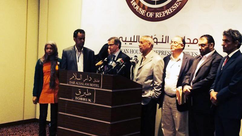 The Special Representative of the Secretary-General for Libya, Bernardino Leon, with Libyan MPs speaking to the media after a meeting with the House of Representatives' members and its president. Tobruk, Monday 27 October 2014 | |