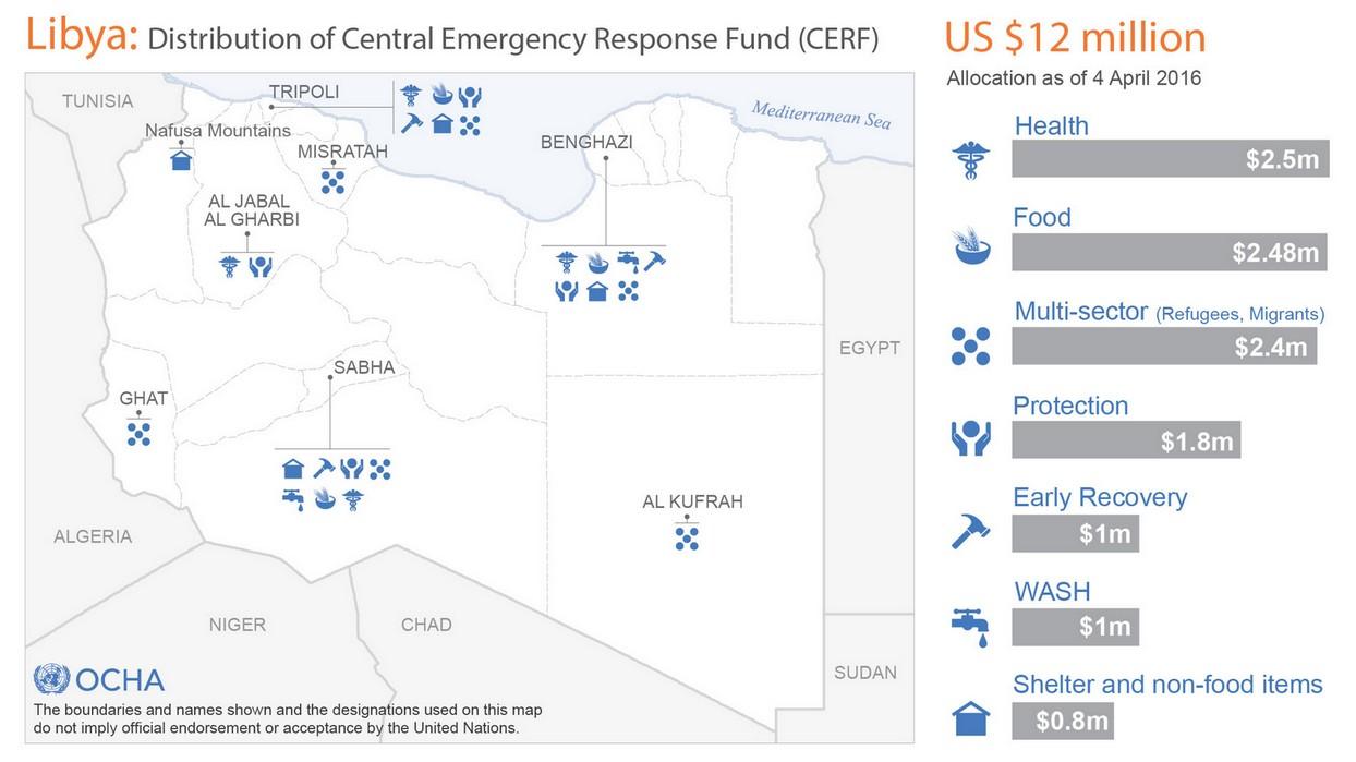 Tunis, 20 April 2016 - An injection of US$12 million from the United Nations Central Emergency Response Fund (CERF) has provided much-needed financing for priority projects from the Libya Humanitarian Response Plan (HRP). Under the allocation, $2.5 million has been distributed to address health needs, $2.48 million to food assistance, $2.4 million to life-saving support to refugees and migrants and $1.8 million to protection. Early recovery and Water, Health and Sanitation (WASH) programmes have received $1 million each, with Shelter and Non-Food Items (NFIs) programmes receiving $800,000.With 2.44 million people in need of humanitarian assistance in Libya, the funding will provide relief for internally displaced persons (IDPs), refugees, migrants, asylum-seekers and vulnerable conflict-affected communities across the country.