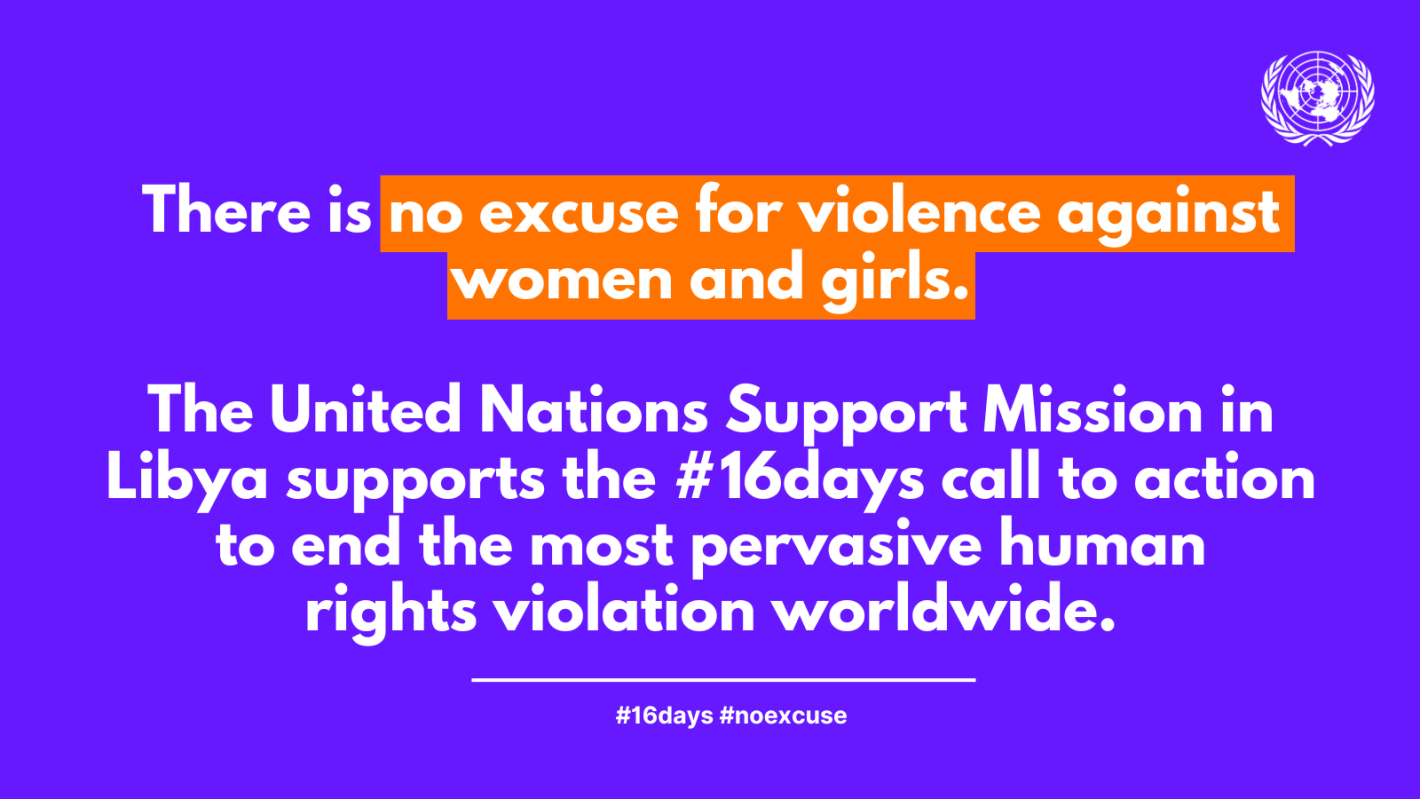 TRIPOLI, 26 November 2023 - The United Nations Support Mission in Libya (UNSMIL) stands united with Libyan defenders of women’s rights in supporting the 16 days of activism for the elimination of violence against women and girls.
